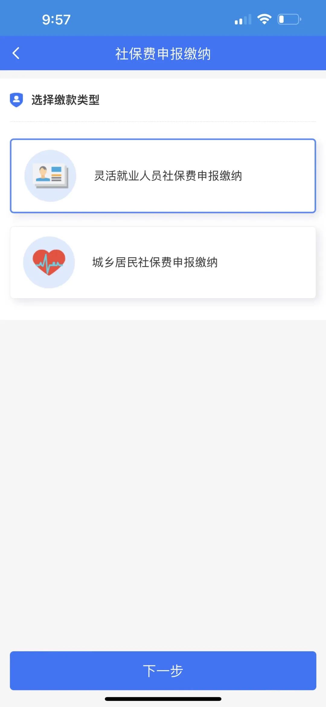 选择灵活就业人员社保费申报缴纳,点击下一步;点击本人缴纳;