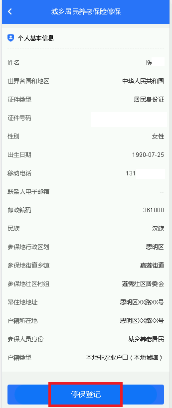 2.核对个人信息,确认无误后,点击停保登记。