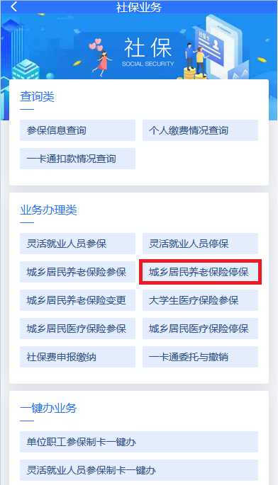 1.点击首页“城乡居民养老保险停保”。