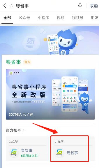 首先,微信搜索“粤省事”,点击进入“粤省事”小程序(点击进入)。