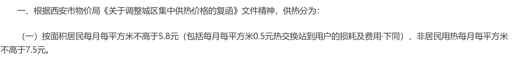 根据西安《关于调整城区集中供热价格的复函》: