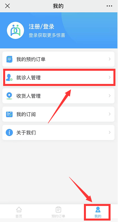 点击【我的】—【就诊人管理】,如实填写就诊人信息并点击添加,预约当日系统将自动填充所添加的就诊人信息。注:手机号和验证码仅新用户首次登录需要填写。
