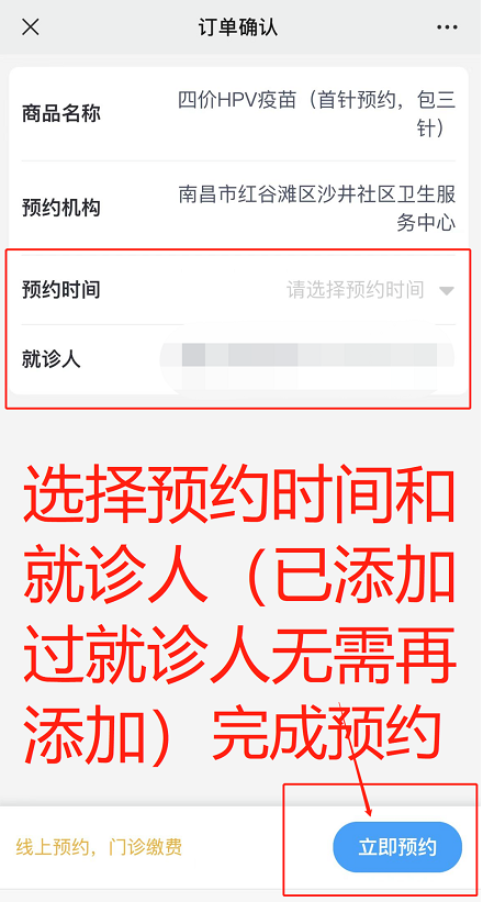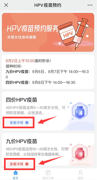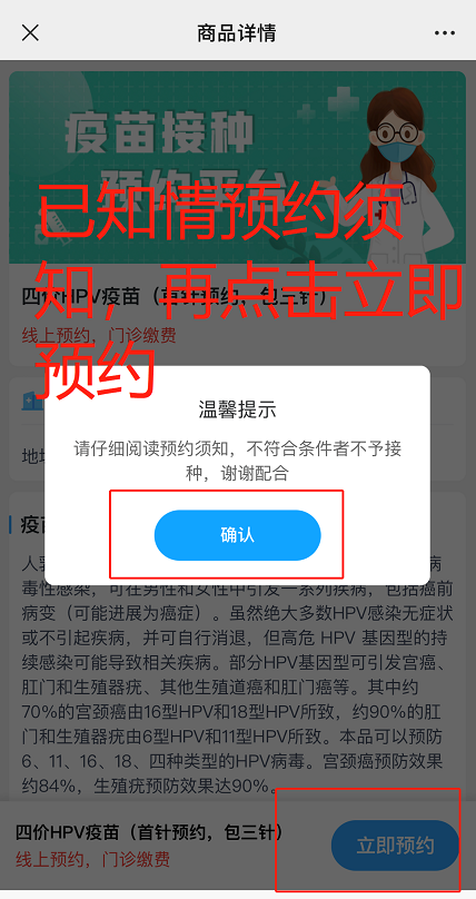 点击选择对应的HPV疫苗(只能选择其中一个)—点击【立即预约】