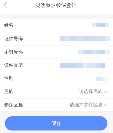 4、填写完个人信息后,选择民族和参保区县,点击“保存”。