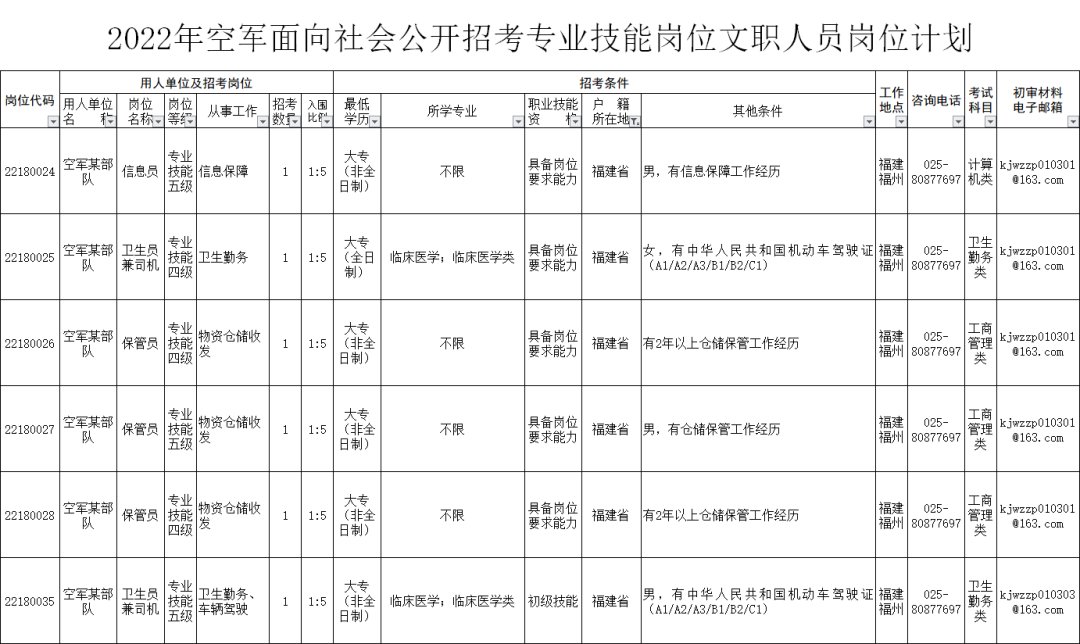 2022年空军面向社会公开招聘文职岗位(福建)