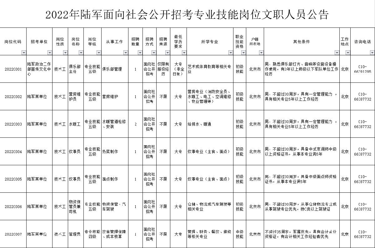 点击下载:2022年陆军面向社会公开招考专业技能岗位文职人员岗位计划