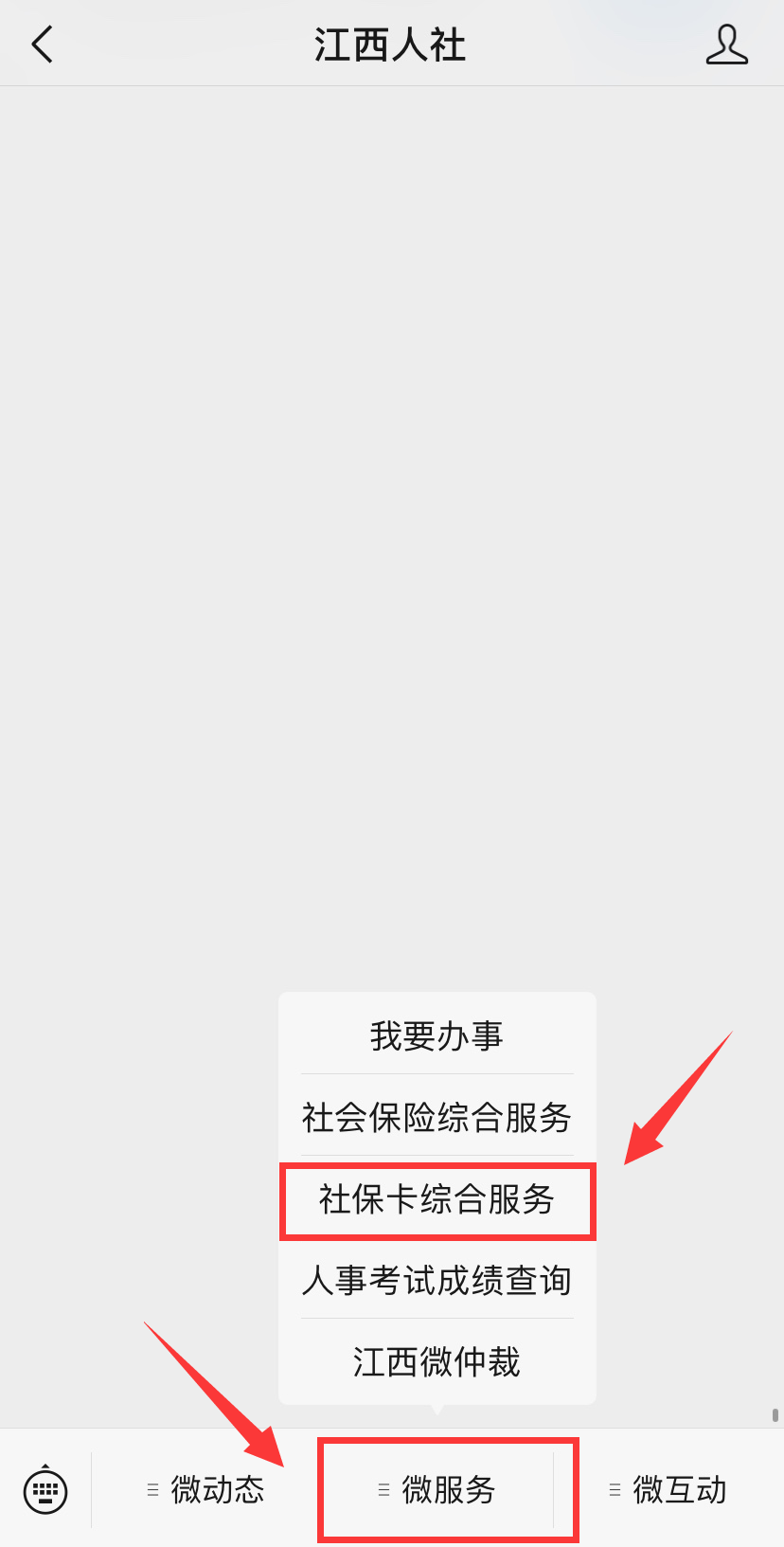 进入“江西人社”微信公众号——点击底部菜单栏“微服务”——点击子菜单栏“社会保险综合服务”。