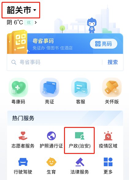 1、定位在韶关市,在主页“热门服务”一栏中点击“户政(治安)”;