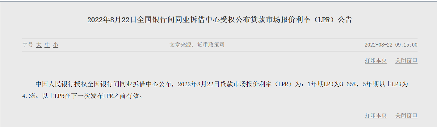 8月22日,央行授权全国银行间同业拆借中心公布,1年期LPR为3.65%,5年期以上LPR为4.3%,分别较上一期下调5个和15个基点。