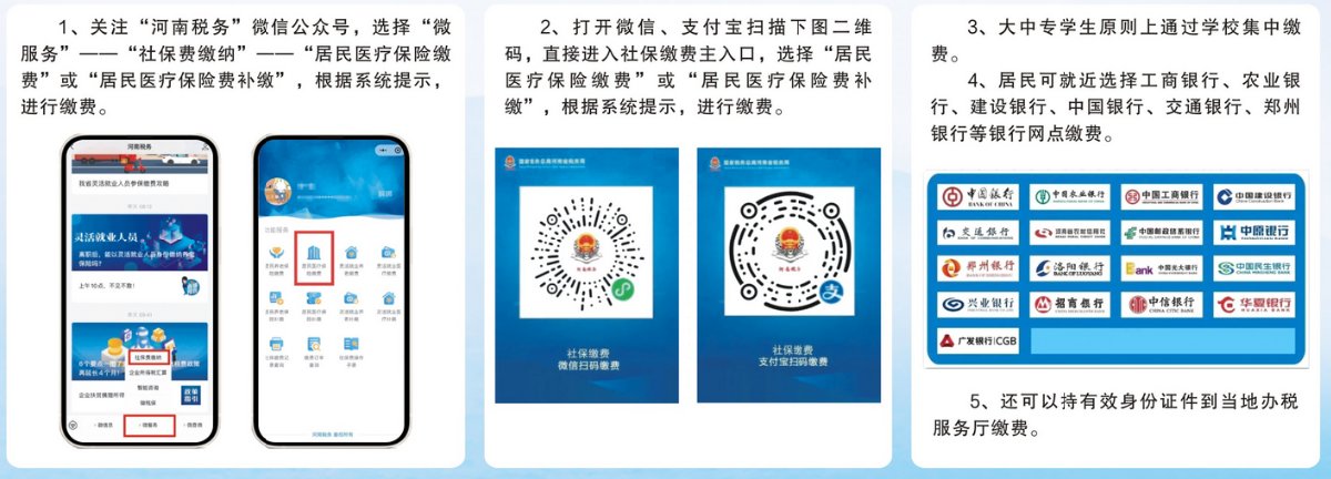 1、关注“河南税务”微信公众号,选择“微服务”——“社保费缴纳”——“居民医疗保险缴费”或“居民医疗保险费补缴”,根据系统提示,进行缴费。