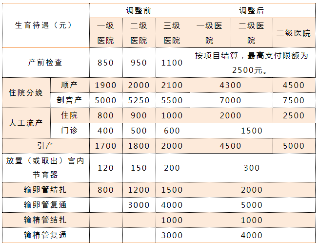 例如,调整前,张女士在市内一级(镇级医院)、二级(县级医院)、三级(市级医院)医院进行产前检查发生的核准医疗费用分别为850元、950元、1100元,调整后进行产前检查发生的核准医疗费用按项目结算,最高支付限额为2500元。在市内一级、二级、三级医院住院分娩(顺产)发生的核准医疗费用调整前为1900元、2000元、2100元,调整后的核准医疗费用一级、二级医院均为4300元,三级医院为4500元;在市内一级、二级、三级医院住院分娩(剖宫产)发生的核准医疗费用调整前为5000元、5250元、5500元,调整后的核准医疗费用一级、二级医院均为7000元,三级医院为7500元。