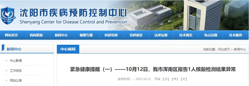 10月12日,我市浑南区报告在开展重点人群核酸检测筛查时发现1人核酸检测结果异常。