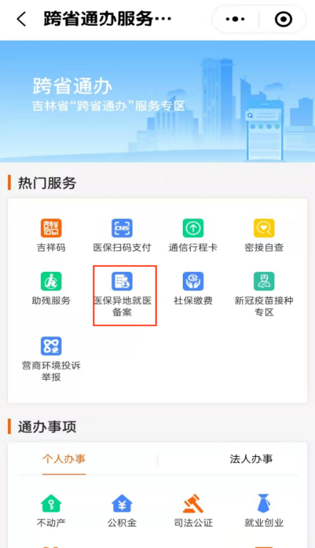 1.登录“吉事办”小程序,在“特色服务”中点击“跨省通办”,选择“医保异地就医备案”。