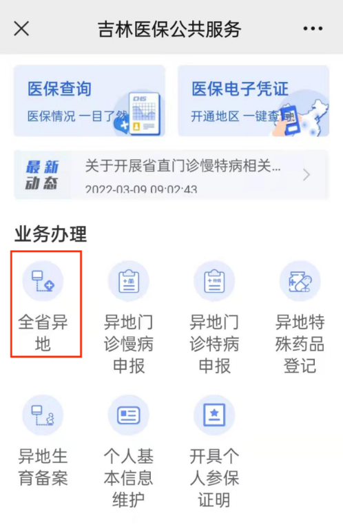 1.登入“吉林医保公共服务”微信公众号,进入服务大厅。在“业务办理”中选择“全省异地”。