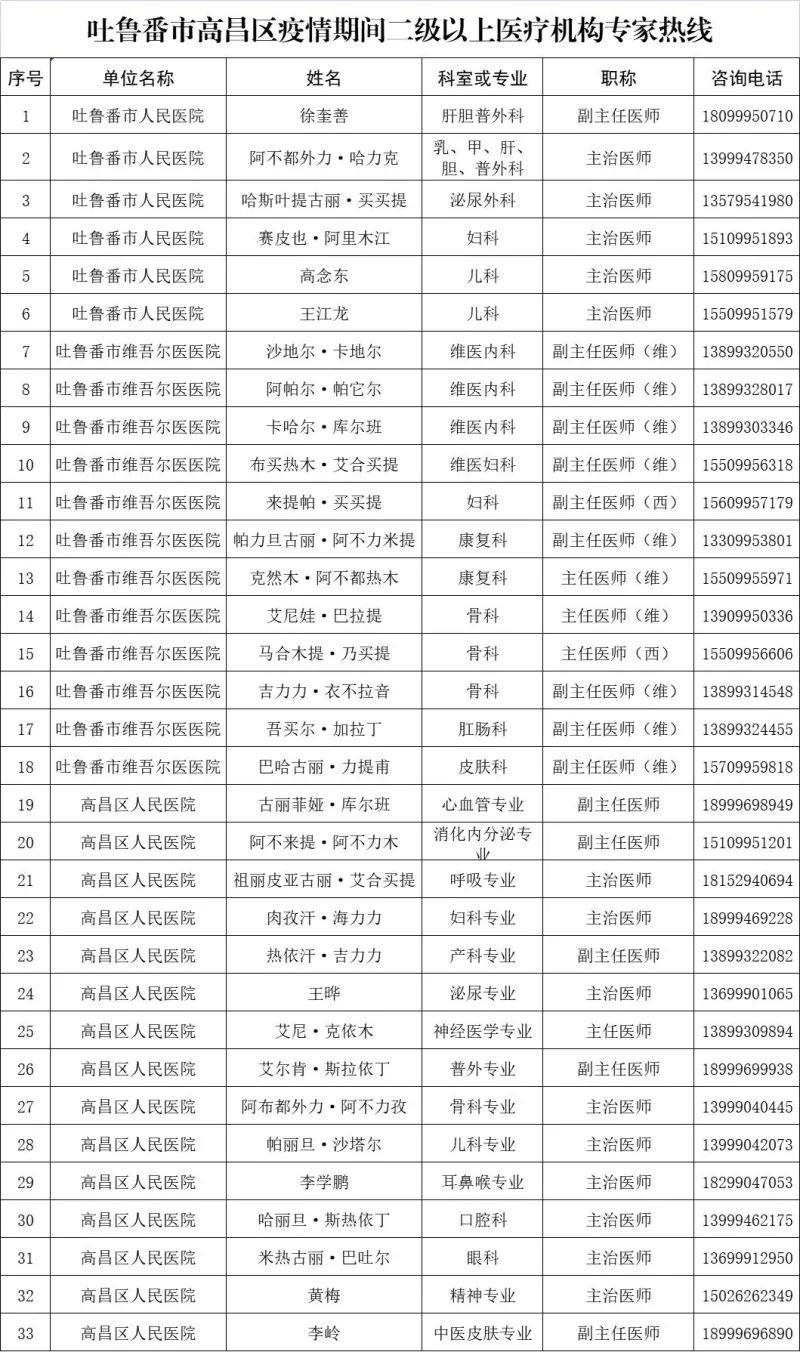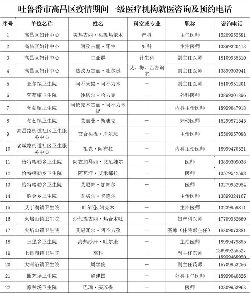 吐鲁番市高昌区疫情期间各级医疗机构就医咨询及预约电话