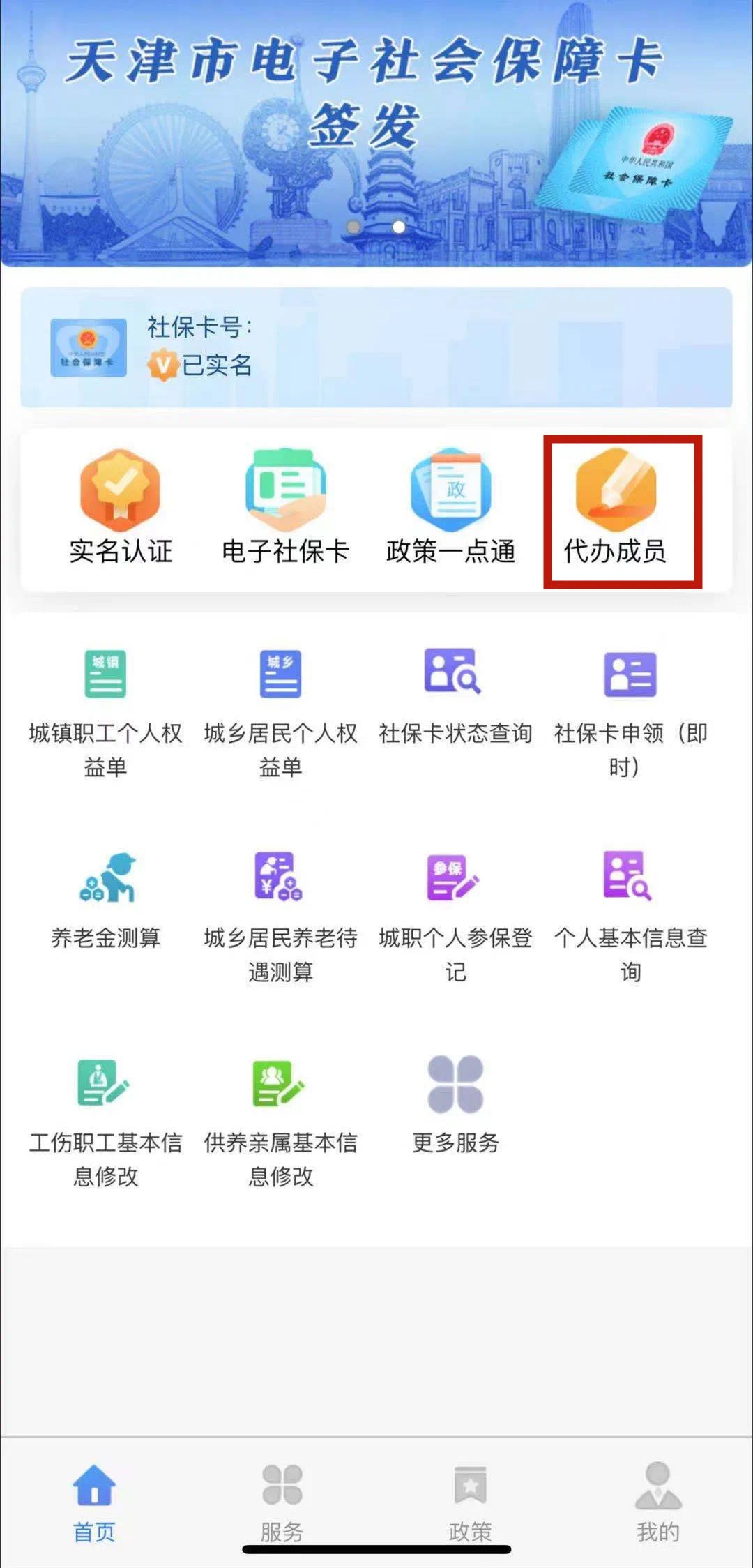 二、添加代办成员,可根据需要添加需代办社保卡成员,添加成功后,即可为该成员代办社保卡。如下图所示,登录进入“天津人力社保”手机APP后,点击“代办成员”进入页面,选择需要申领的代办对象,点击“下一步”,点击“添加成员”。