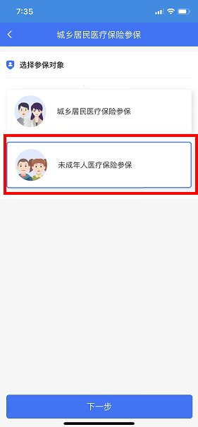 1.进入社保业务页面后,在业务办理类中点击“城乡居民医疗保险参保”;选择参保对象“未成年人医疗保险参保”,点击下一步。