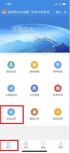 登录厦门税务APP,下方点击首页,选择社保业务。