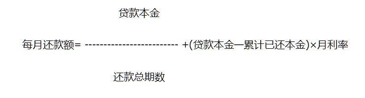 即在贷款期内,每月等额偿还贷款本金,贷款利息随已偿还的本金逐月递减,其计算公式为: