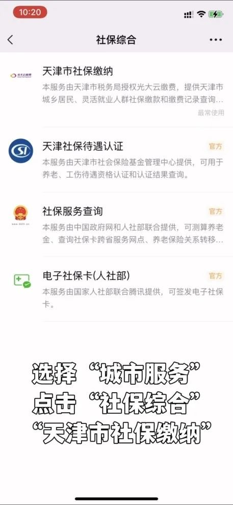 2. 选择“城市服务”点击“社保综合”“天津市社保缴纳”。