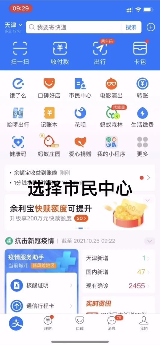 1. 支付宝首页——选择市民中心。
