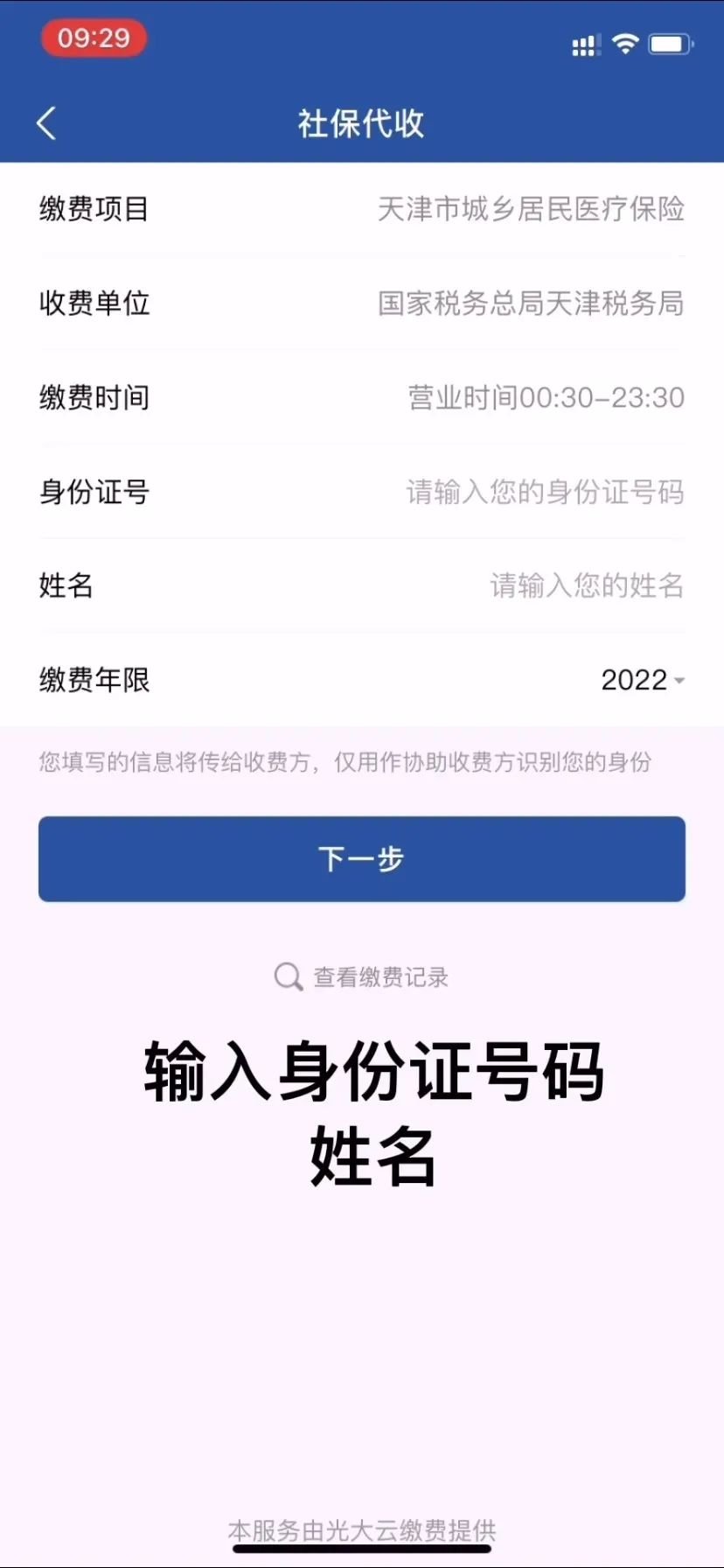 4. 输入身份证号码、姓名、点击“下一步”。