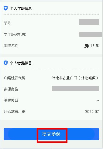 2.核对个人基本信息、学籍信息、缴费信息,确认无误后,点击提交参保;提示“提交成功”。