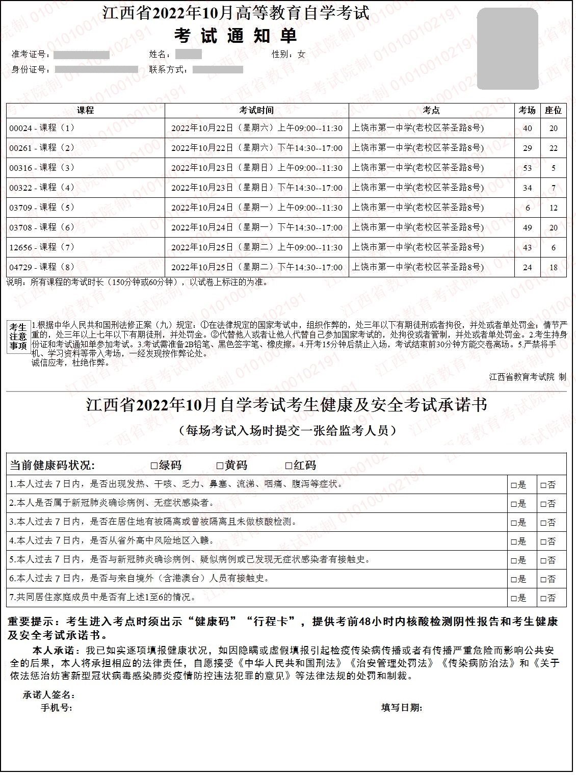 2022年10月15日开始,考生可登录江西省教育考试院网站,网上填写并提交《江西省2022年10月自学考试考生健康状况报告表》,按本人此次参加考试场次数下载打印《江西省2022年10月高等教育自学考试考试通知单》若干张,如实填写下端的《江西省自学考试考生健康及安全考试承诺书》,如弄虚作假或瞒报自身健康异常情况而造成严重后果的将依法依规追究责任。