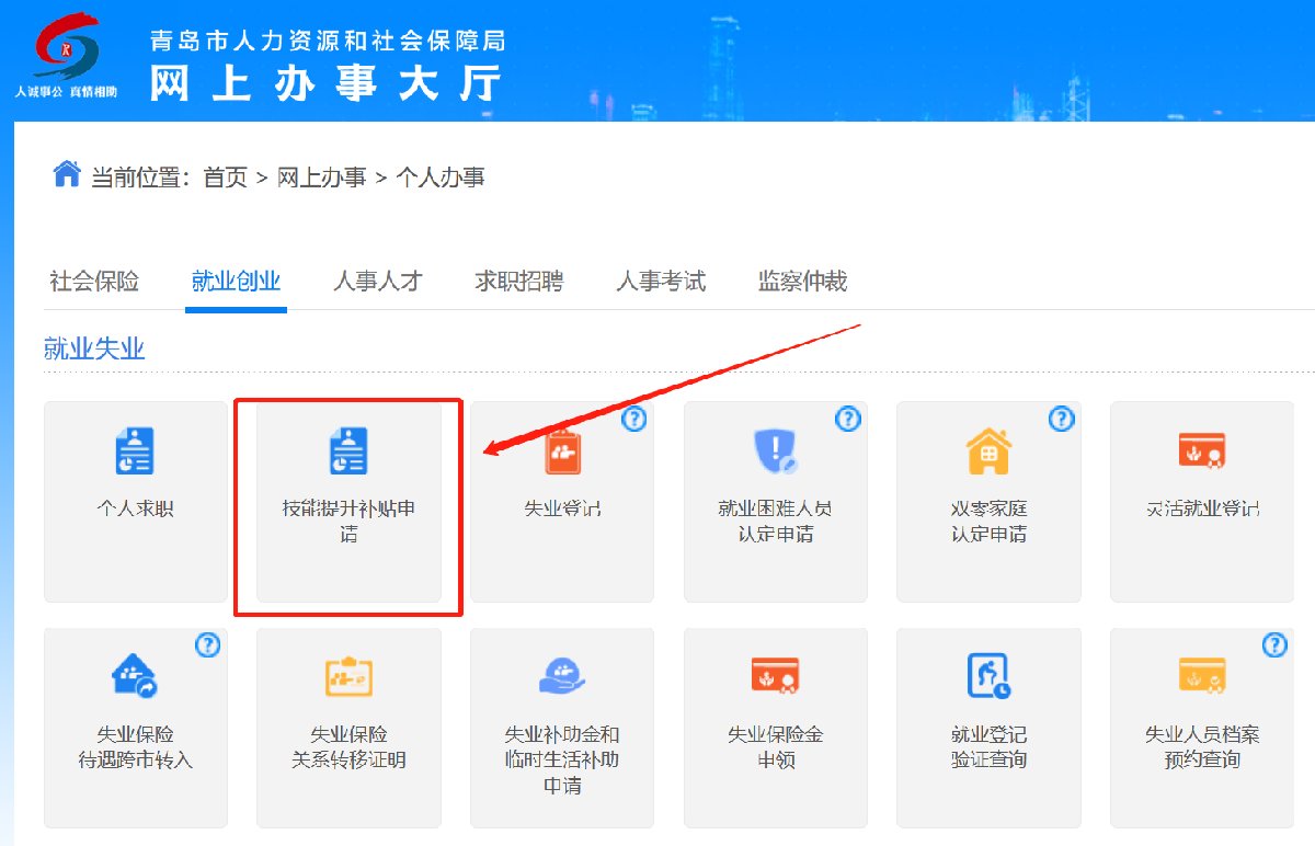 青岛市人力资源和社会保障局网上办事大厅(个人办事/就业创业/就业失业/技能提升补贴申请)