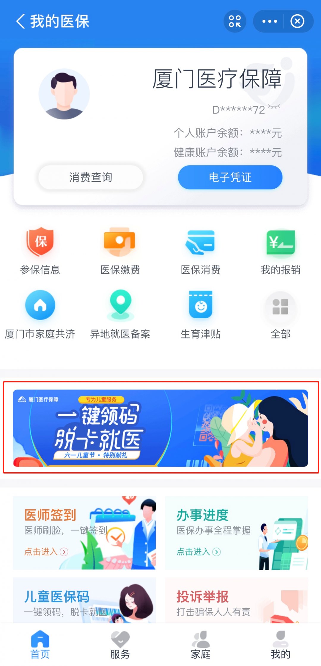 支付宝端:支付宝搜索“厦门医疗保障”服务号进行预参保登记、缴费后,申领新生儿专属“儿童医保码”