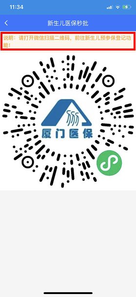 微信端:打开微信扫描二维码,跳转至厦门医疗保障局小程序,选择新生儿预参保登记功能。