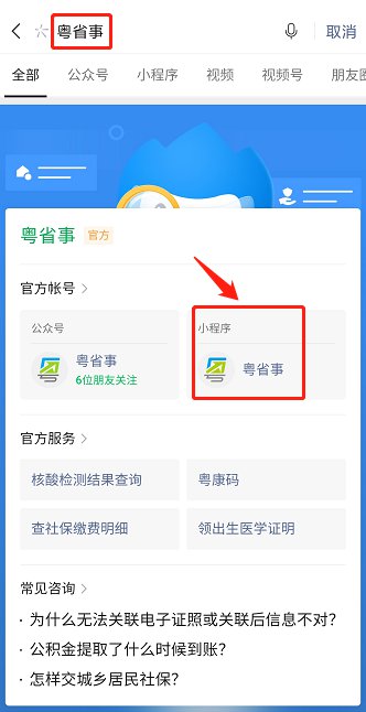 首先,微信搜索“粤省事”,点击进入“粤省事”小程序(点击进入)。