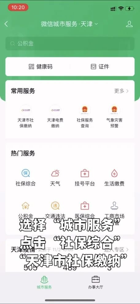 2. 选择“城市服务”点击“社保综合”“天津市社保缴纳”。