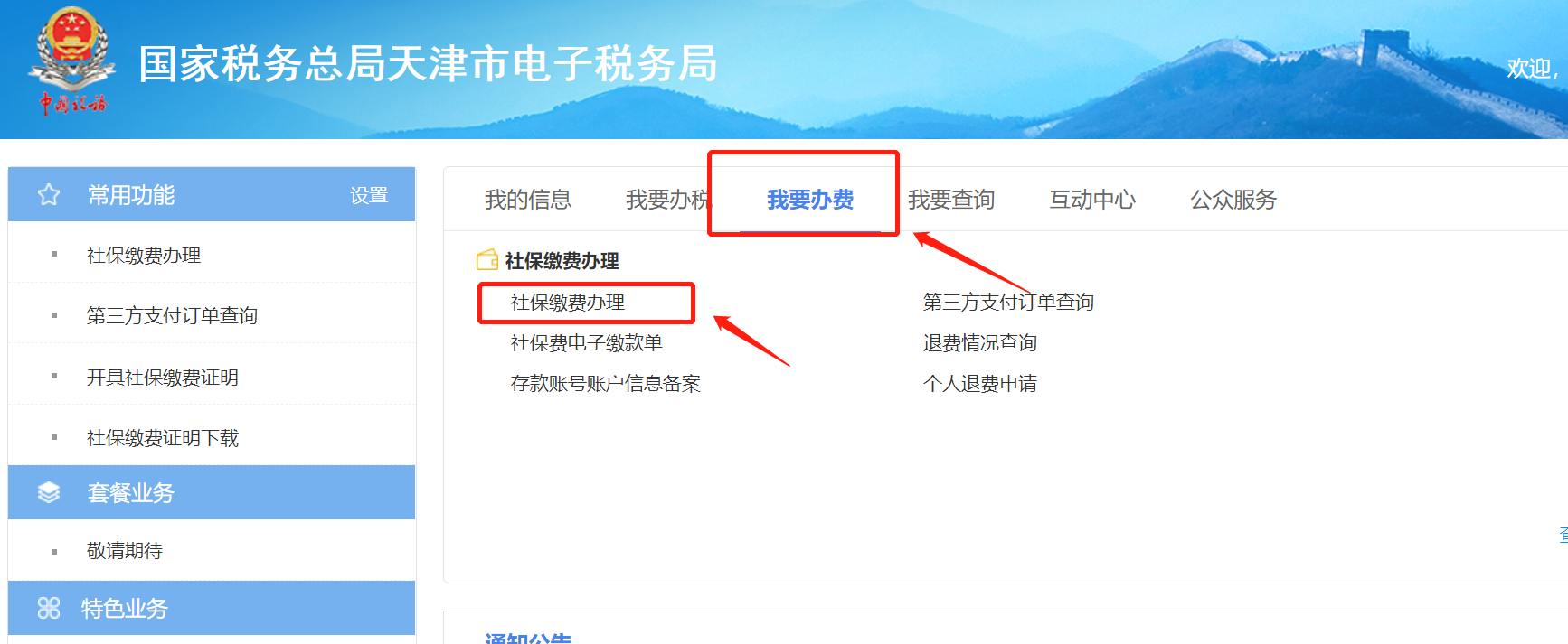 2、进入官网后,在屏幕上方菜单栏找到“我要办费”入口,点击“社保缴费办理”;
