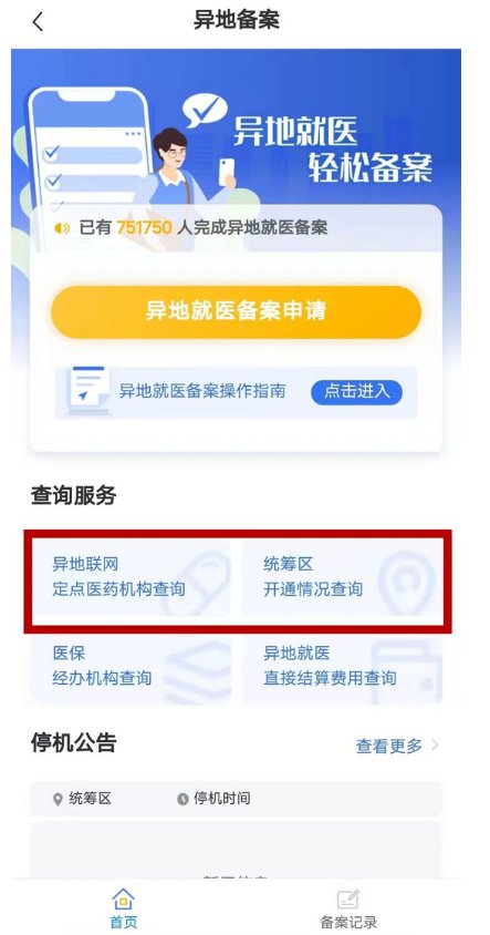 异地就医备案办理成功后,参保人员可前往备案就医地所有已开通跨省异地就医联网直接结算功能的医保定点医院就医,在“国家医保服务平台”APP首页“异地备案”页面,可查询统筹地区及定点医疗机构和定点药店的开通情况: