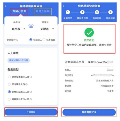 在办理页面可以“为自己备案”,也可以“为他人备案”。根据申请人的实际情况,选择“参保地”、“就医地”、“参保险种”、“备案类型”后,点击【开始备案】,按页面提示进行操作。