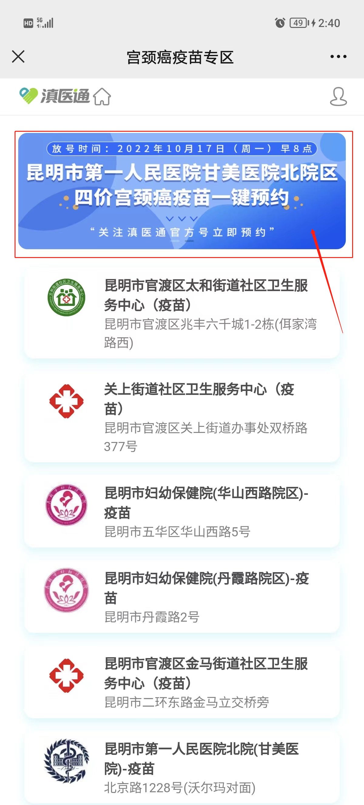 第三步:点击首页上方【昆明市第一人民医院甘美医院北院区四价宫颈癌疫苗一键预约】
