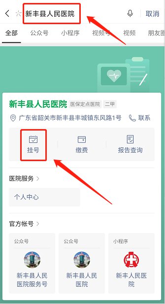 微信搜索“新丰县人民医院”,点击“挂号”。
