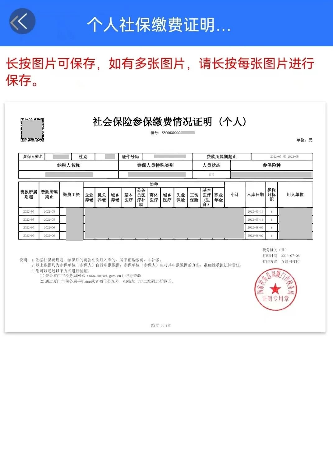 厦门税务APP个人社保缴费证明开具