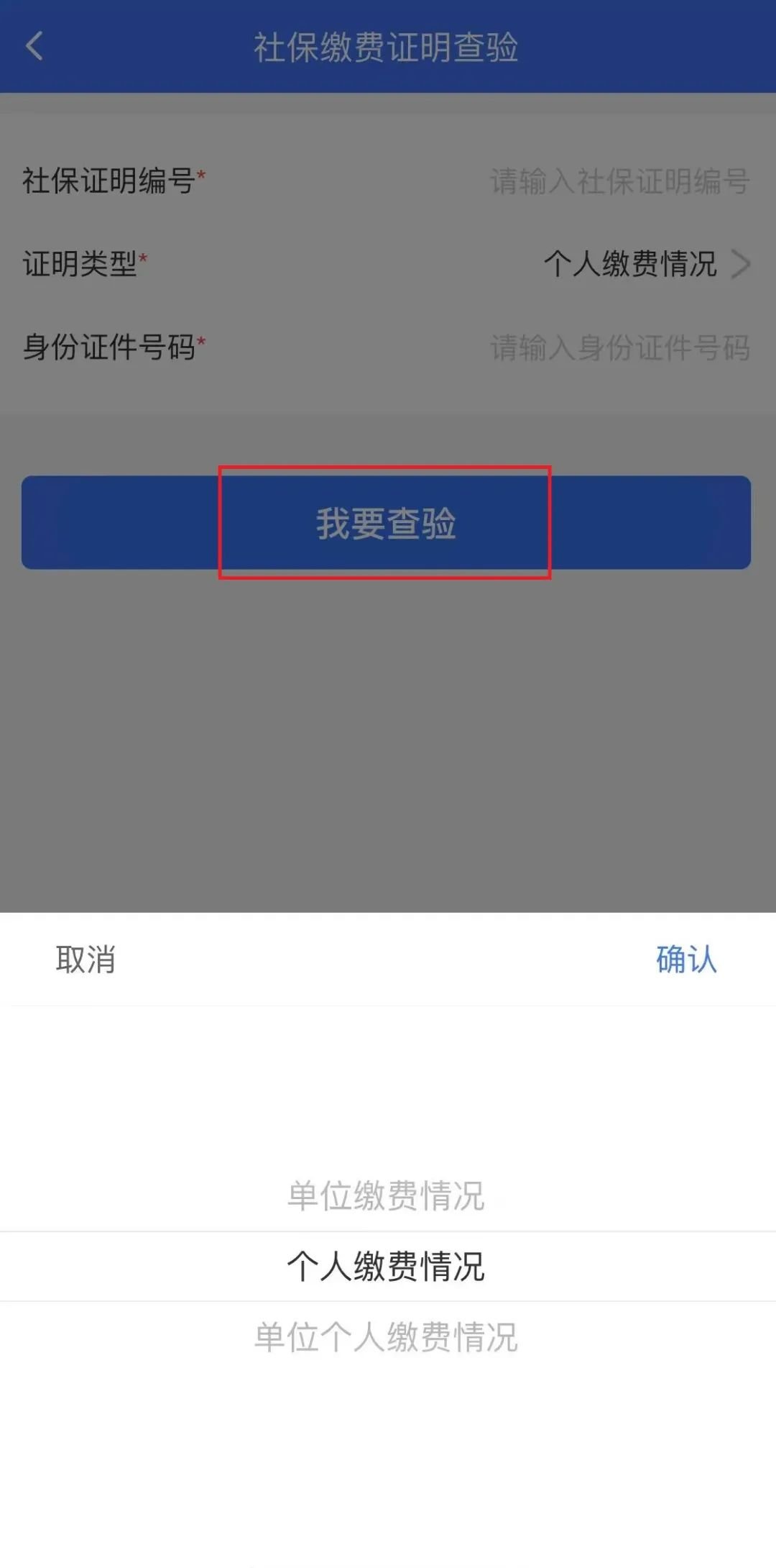 ②选择相应的【证明类型】,输入【社保证明编号】、【身份证件号码】,点击【我要查验】。