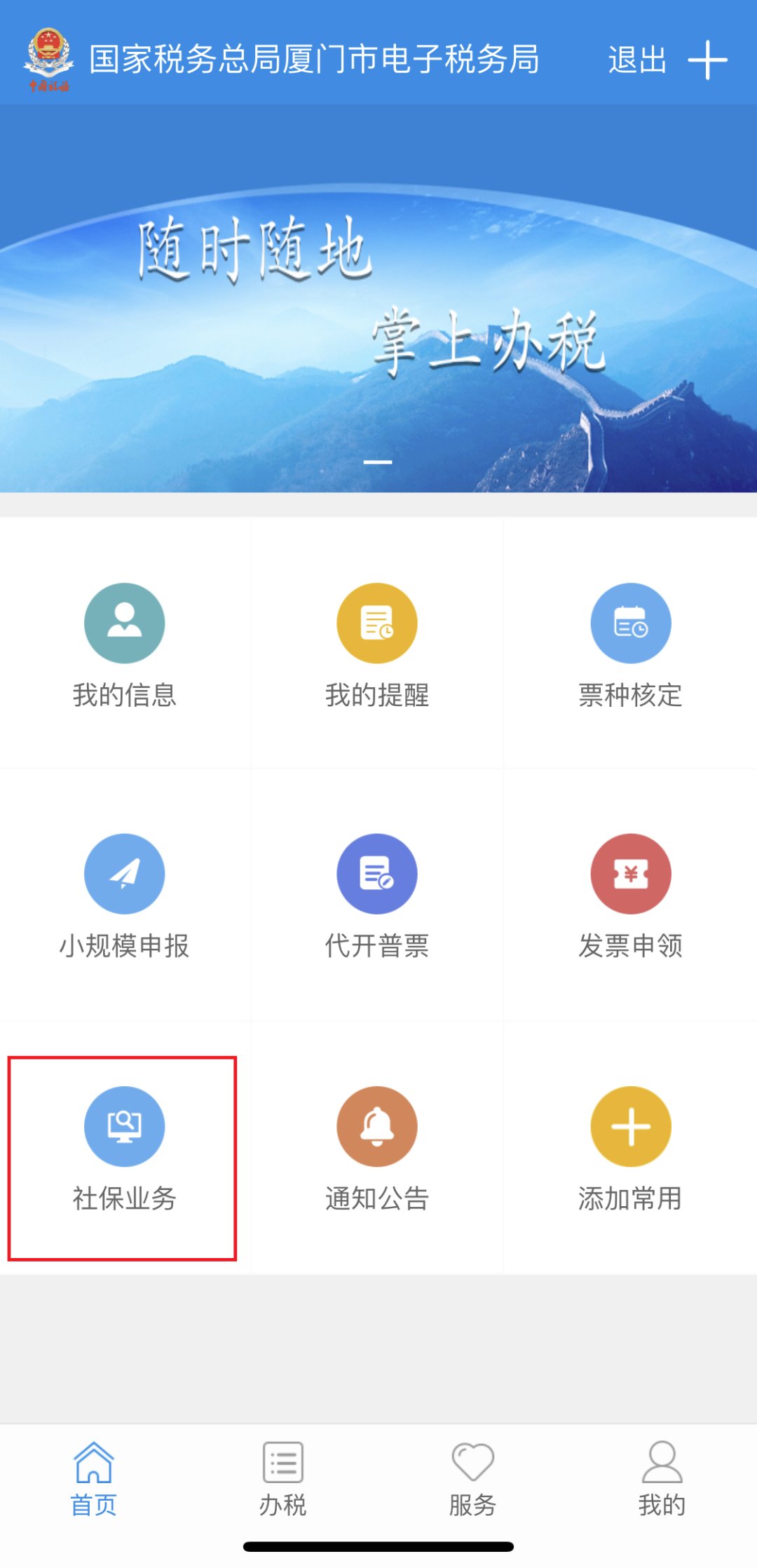 下载安装厦门税务APP。登录厦门税务APP,下方点击首页,选择社保业务。