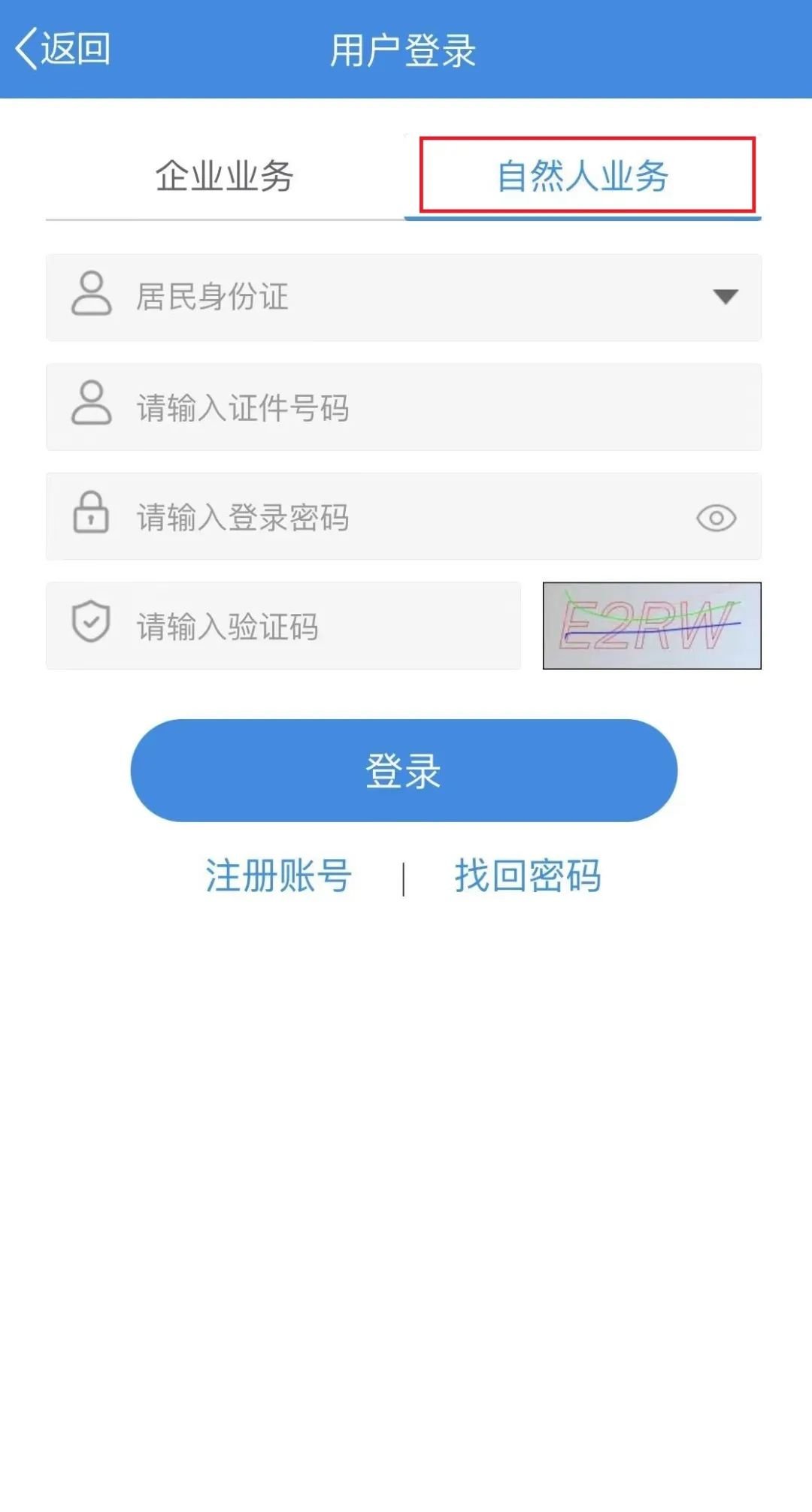 ①打开厦门税务APP,选择【自然人业务】,输入账号密码后,点击【登录】;