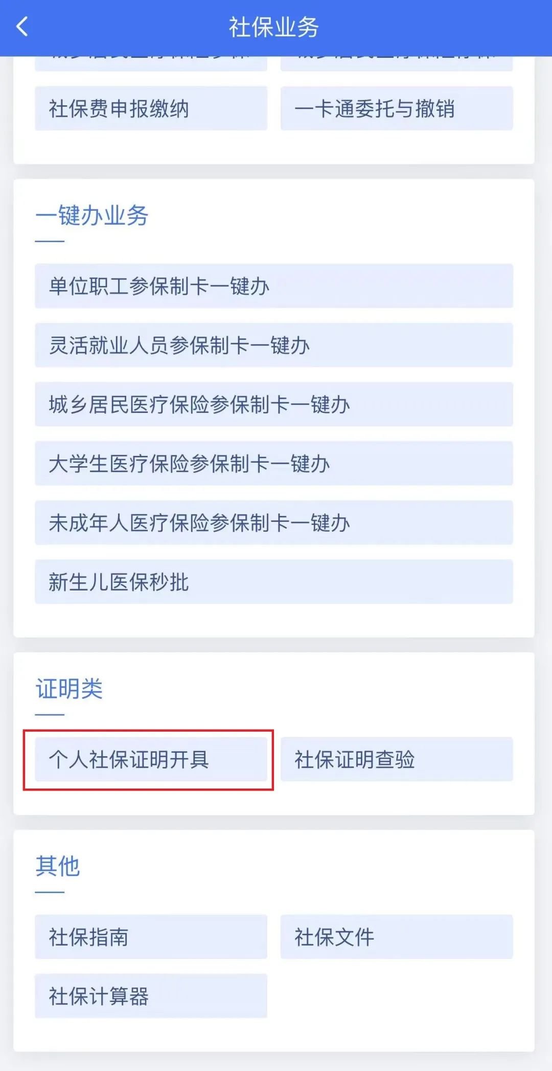 ②选择【社保业务】,下拉界面,点击【个人社保证明开具】;