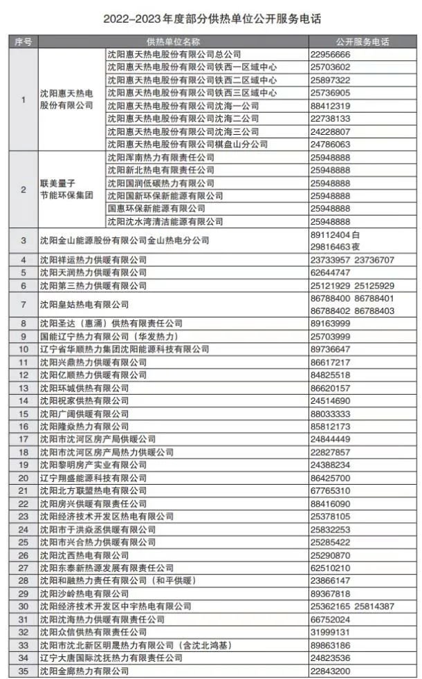 2022-2023年度沈阳部分供热单位公开服务电话一览