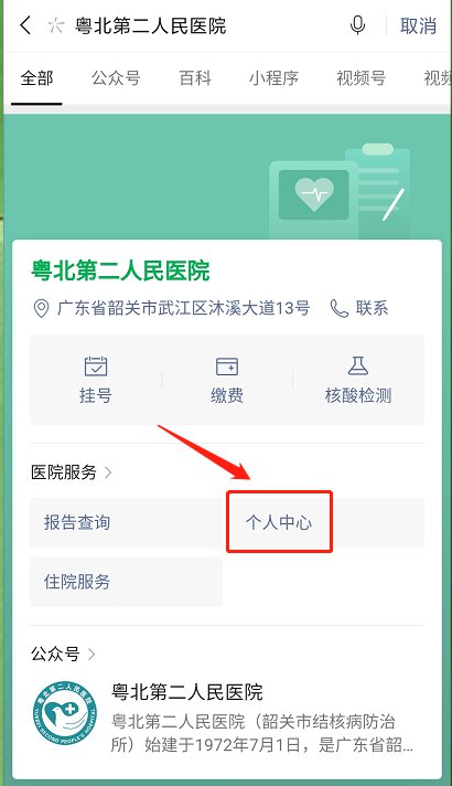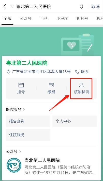 首先,微信搜索“粤北第二人民医院”,点击“核酸检测”,进入挂号界面