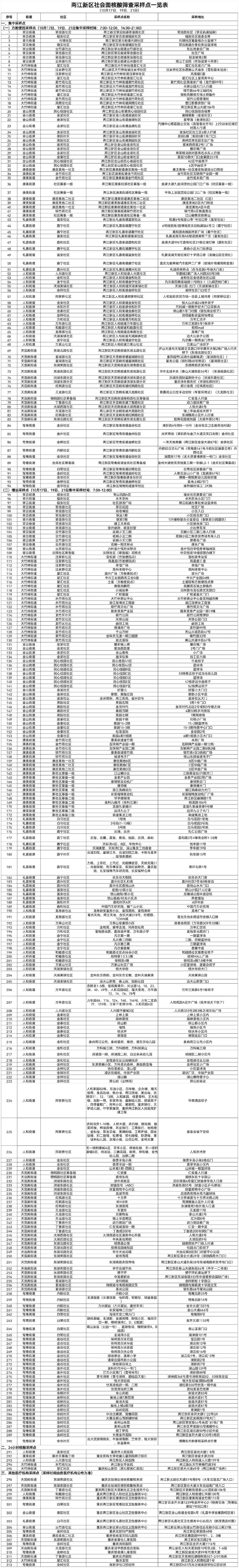 因疫情防控形势需要,为切实保障您和家人的生命安全和身体健康,根据《新冠肺炎防控方案(第九版)》和市疫情防控核酸检测组工作安排,经两江新区新型冠状病毒肺炎疫情防控指挥部研究,决定于2022年10月17日(星期一)、19日(星期三)、21日(星期五)开展社会面核酸筛查。综合考虑市民朋友们的工作生活规律,结合医疗资源统筹等因素,为方便您就近、及时采样,现作如下通告: