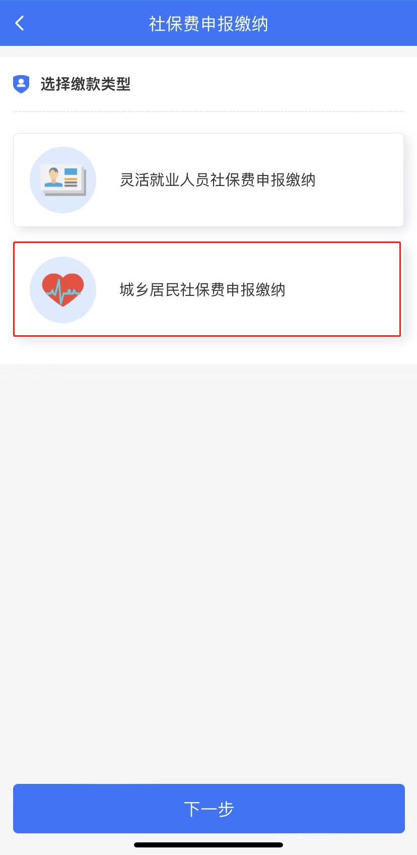 (2)选择“城乡居民社保费申报缴纳”,点击下一步;