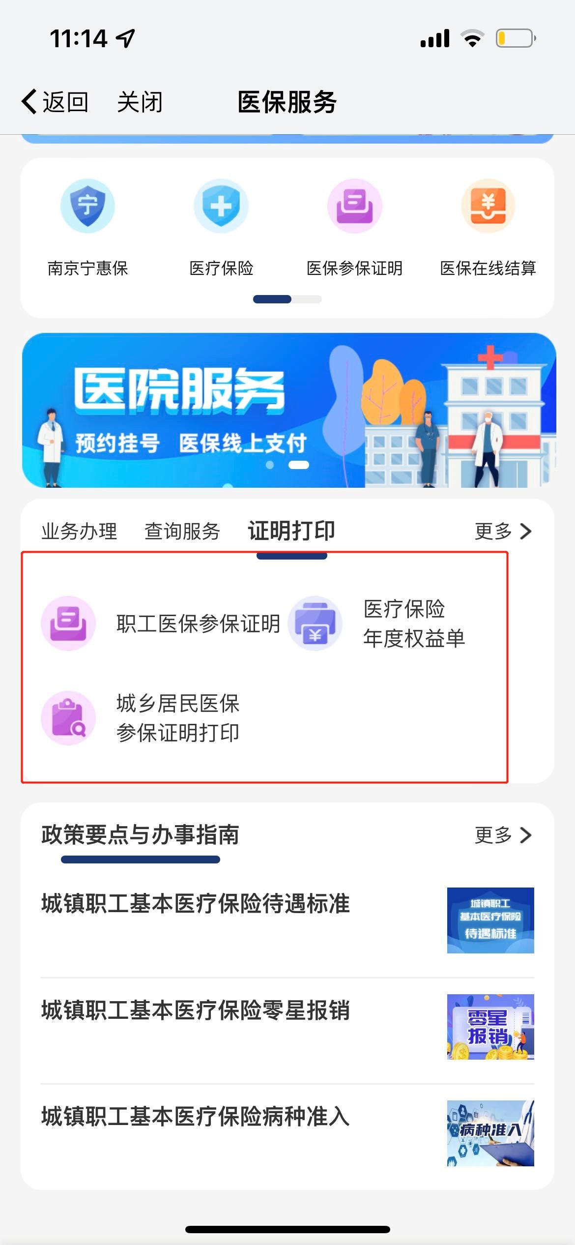 城乡医保:“我的南京”APP“——健康——医保服务——证明打印——城乡居民医保参保证明打印