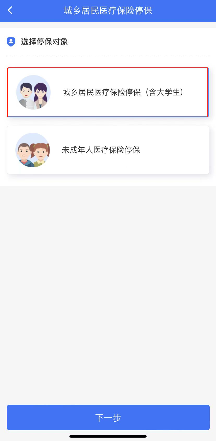 (1)登录首页后,选择“办税”-“社保业务”,点击“城乡居民医疗保险停保”;选择停保对象“城乡居民医疗保险停保(含大学生)”,点击下一步;