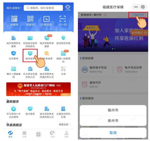 1.在闽政通APP首页,点击【医保服务】进入。在页面右上角点击【切换参保地】选择需要办理暂停参保业务的地方。